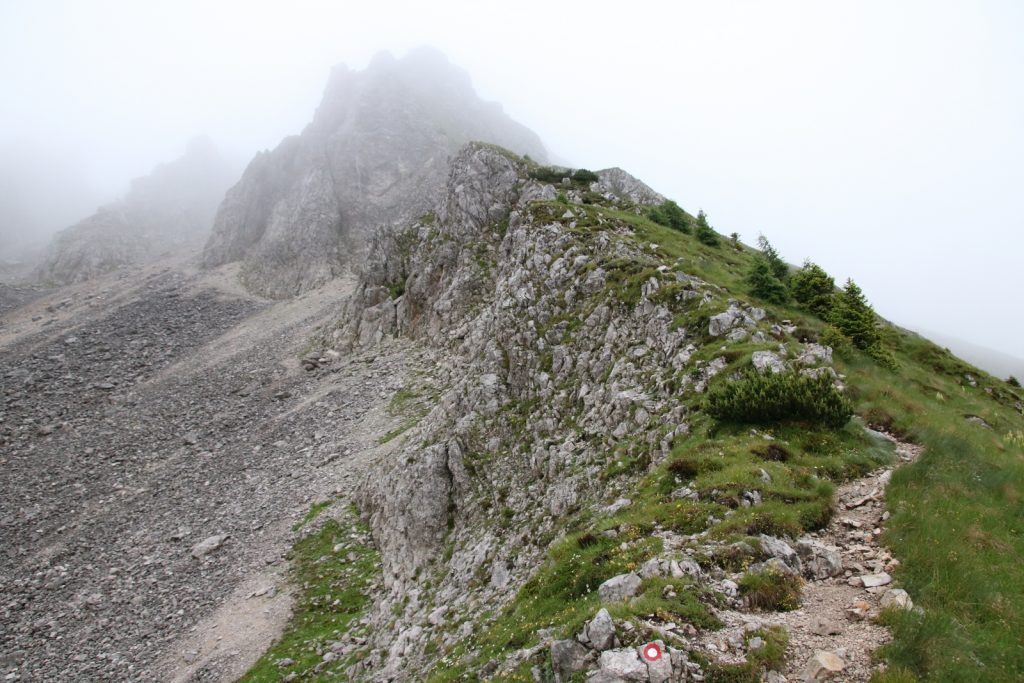 Od koče stopimo čez cvetoči travnik, kar nekako v smeri našega cilja, ki ga sedaj že prav dobro vidimo in na drugi strani nadaljujemo po lepi stezi. Sledimo markacijam, večji odcep je zgolj eden, neoznačena pot nas desno vodi proti Suhemu ruševju. Tudi obiska vredni konci, toda ne danes. Prečimo pobočja Vrtače, vsi odcepi levo ne bodo pravi. Pot se začne strmo vzpenjati, pridemo na greben in mu sledimo proti vrhu. Ker je na avstrijski strani gore očitno precejšen podor porušil strmo steno, bomo morali biti na tem delu pazljivi. Pot je sedaj speljana bolj po slovenski strani, stran od nevarnih pobočij, ki bi lahko zgrmela v globino. Še nekaj vzpona in že nas čaka vrh.