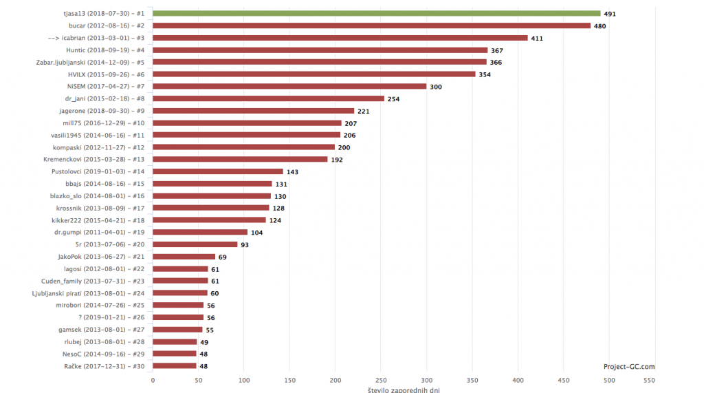 Ekipa tjasa13 je torej konec novembra z vrha lestvice geolovcev z največ zaporednimi dnevi z vsaj eno najdbo (kar v angleščini zaobjamejo z besedo streak) sklatila ekipo bucar, ki je svojo serijo konec leta 2013 zaključila pri 480 dnevih. Po slabih šestih letih na vrhu je bil res že čas za spremembo.