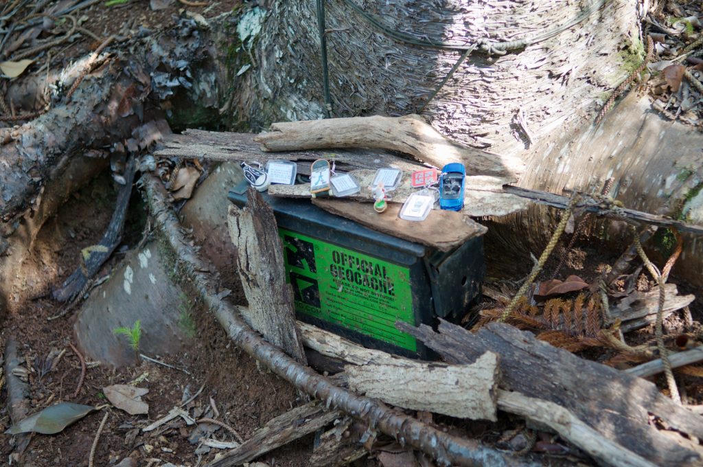 Obiskal sem ga za zaključek dolgega geolovskega dneva. Za seboj sem imel že nekaj ur hoje na krater Diamond Head in po vzhodnem predmestju Honoluluja, pa sem vseeno izkoristil možnost, da me prijatelj, ki je imel opravke v mestu, na poti domov odloži na izhodišču ‘Aiea Loop Trail, pohodniške poti po enem od državnih naravnih parkov nekaj sto metrov nad morjem. Od tam je do GC23 manj kot 500 m zračne črte, vendar je zaradi razgibanega reliefa pot nekajkrat daljša. Utrujenosti in nekaj res blatnim odsekom navkljub je bila pravi užitek. Dišeči limonovi evkaliptusi, bujno zelenje, nenavadni iglavci (vsaj zdeli so se iglavci), visoke preslice in praproti … Ves čas sem imel občutek, da bo iz kakega posebej nenavadnega grma kot v Jurskem parku pričivkal kak velociraptorček. Dokler nisem prišel do točke, kjer se od steze odcepi dobro izhojena geostezica in pripelje do nenaravne kopice vej in lubja. Hura! 🙂 Zadržal sem se kakih 15 minut za fotoseanso in kratek počitek, potem pa sem se namesto do naslednjega zaklada raje usmeril nazaj na izhodišče, da ujamem prvega od le treh popoldanskih avtobusov.