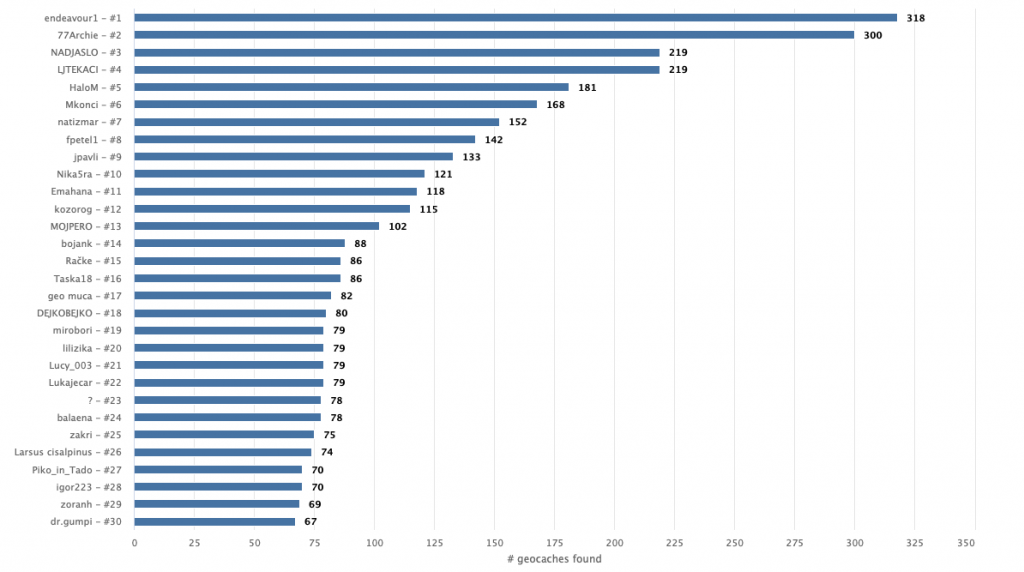 Kaj statistika pravi za junij? Očitno so domači geolovci odpotovali v tuje kraje, saj je obiskanost domačih škatlic opazno padla. Druga opazka pa je, da so se v naše kraje vrnili tudi tuji geolovci! Slabe dve tretjini najdb je ustvarilo 552 domačih ekip, ostalo tretjino pa 295 tujih ekip. Skupaj smo pologirali tako 847 zakladkov. Vsaj deset zakladov je poiskalo 153 domačih ekip, dvajset najdb je vknjižila pa okrogla stotica ekip. Prek najvišje letvice, to je sto najdb, je seglo 13 ekip. Najvišje uvrščeni trije so tokrat: endeavour1 (318), 77Archie (300), LJTEKACI in NADJASLO (219). Če se ne motim, imamo novega rekorderja na domačih tleh, ki je v mesecu dni pobral največ zakladov od pričetka beleženja podatkov. Čestitke obema, ki sta obrnila tri stotice na števcu!