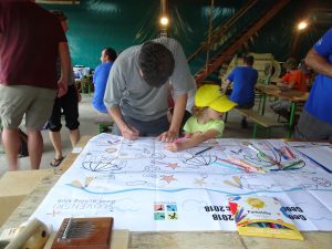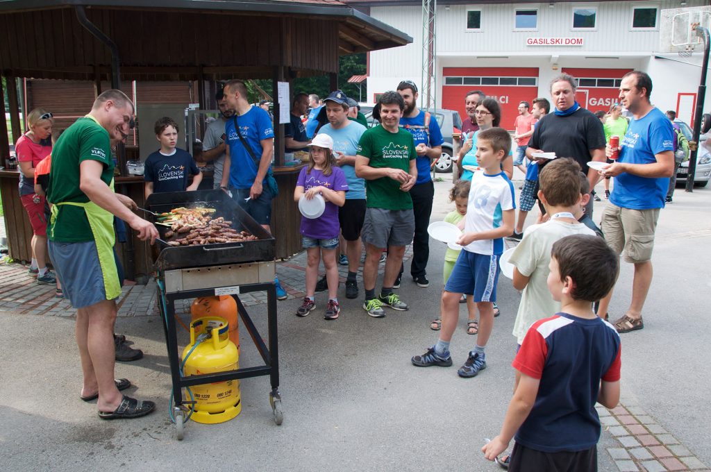Golaž dobrodošlice (in njegov veganski alter ego) smo tokrat začeli deliti ob napovedani uri. Geolovcev je bilo vedno več, tako da je bila v nekem trenutku gneča na recepciji kar velika. Nekaj udeležencev s Hrvaške je dogodku zagotovilo mednarodno dimenzijo, kakega severnega soseda ali naključnega turista pa nismo dočakali. Eni so se skrili v senco pod skedenj, drugi so šli v uk plezanja z vrvno tehniko h Gamsku in Pustolovcu, tretji so se med klepetom umestili tako, da ni bila žeja nikoli prehuda. Otroci so okupirali igrala in žogobrcarski teren. Prevzem tekstilnih naročil je šel kot po maslu. Kar točni smo bili tudi z uradnim delom programa, žrebanjem za glavne nagrade. Letos smo se potrudili, da so bili takojšnji dobitki kar se da geolovsko uporabni. Tudi če jih niste zadeli, vam utegnejo škatlice, dnevniki, magnetki, kompleti za obnovo vsebine zaklada in še kak uporaben predmet za menjavo še to poletje priti v roke na geolovski odpravi. Dobro skriti, seveda. Glavna nagrada na velikem žrebanju, enoletna Premium naročnina na geocaching.com, je šla v roke mladega geolovca, karma je poskrbela, da je plišasti Signal končal v otroških rokah. Ko je žreb (kjer imajo eni vedno srečo 😉) razdelil še preostale sledljvčke, se je na žaru že dogajalo. Tokrat sta se peke lotila dva izkušena mojstra, tako da o kakovosti ni bilo dvoma. Ponudba je komaj dohajala začetno povpraševanje.