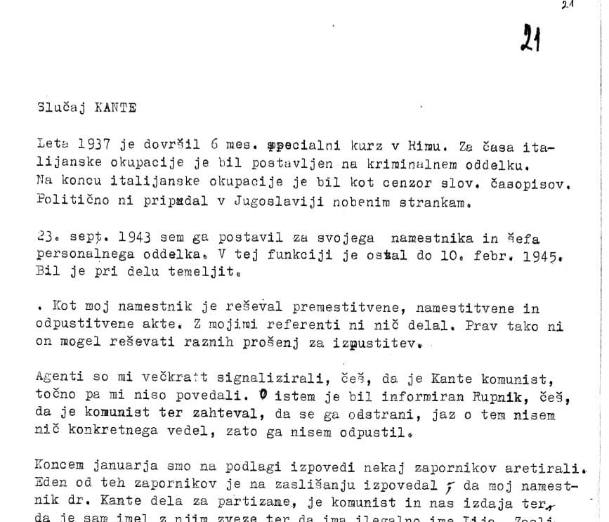 Priložen je primer poročila iz kartoteke dr. Vladimirja Kanteta, katerega je napisala aktivistka OF, ki je bila njegov kontakt. Ter poročilo z zaslišanja Lovra Hacina o aretaciji Kanteta.