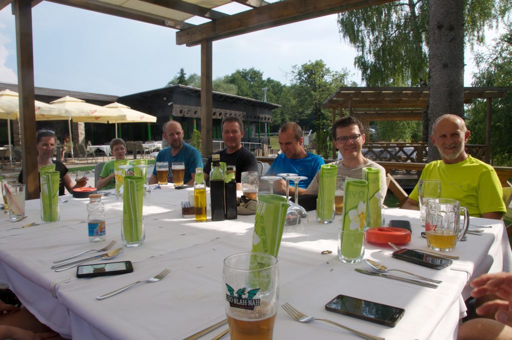 Zaključili smo, kot je Larsus pričakoval in v ta namen rezerviral mizo, na terasi bližnjega znanega ljubljanskega lokala. Tekli so osvežilni napitki, tekel je tudi pogovor. O vsem mogočem. Seveda so bile v središču pozornosti majice Slovenskega geocaching kluba, obdelali smo nedavni piknik, prihajajoče mega-dogodke, piratske spominke in Dan Kanade in še marsikaj. Ne vem, če nismo klepetali vsaj tako dolgo, kot smo veslali novim dogodivščinam naproti.