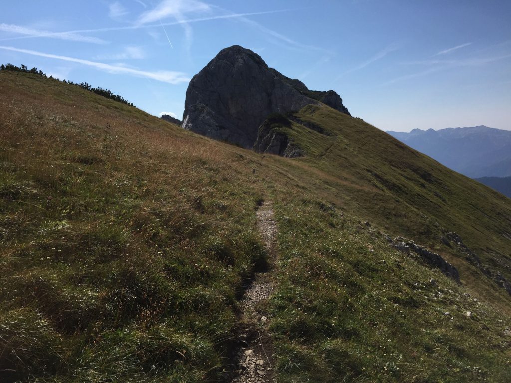Med pastirskimi stanovi poiščemo široko pot naprej po zahodni strani grebena Stogov proti krnici in nekdanji Planini Jezerce, od katere je ostalo samo (za žejnega planinca neuporabno?) korito z vodo. Nekje na pol poti se prvič odpre lep pogled na cilj, ki povprečnemu pohodniku deluje kar malo strašljivo. Pa ni tako. Ob že omenjenem koritu z vodo se med žvižgi svizcev usmerimo navzgor po poti, ki v številnih okljukih pripelje na Jezerski preval. Zahodno od prevala so strme stene Adama in Eve, geolovca pa vodi pot po položnem razglednem travnatem grebenu med nasadi planik proti skalni gmoti Jezerskega Stoga. Izpod stene je do vrha še kakih 50 m višine po gruščnati in mestoma krušljivi poti, vendar brez večjih težav.