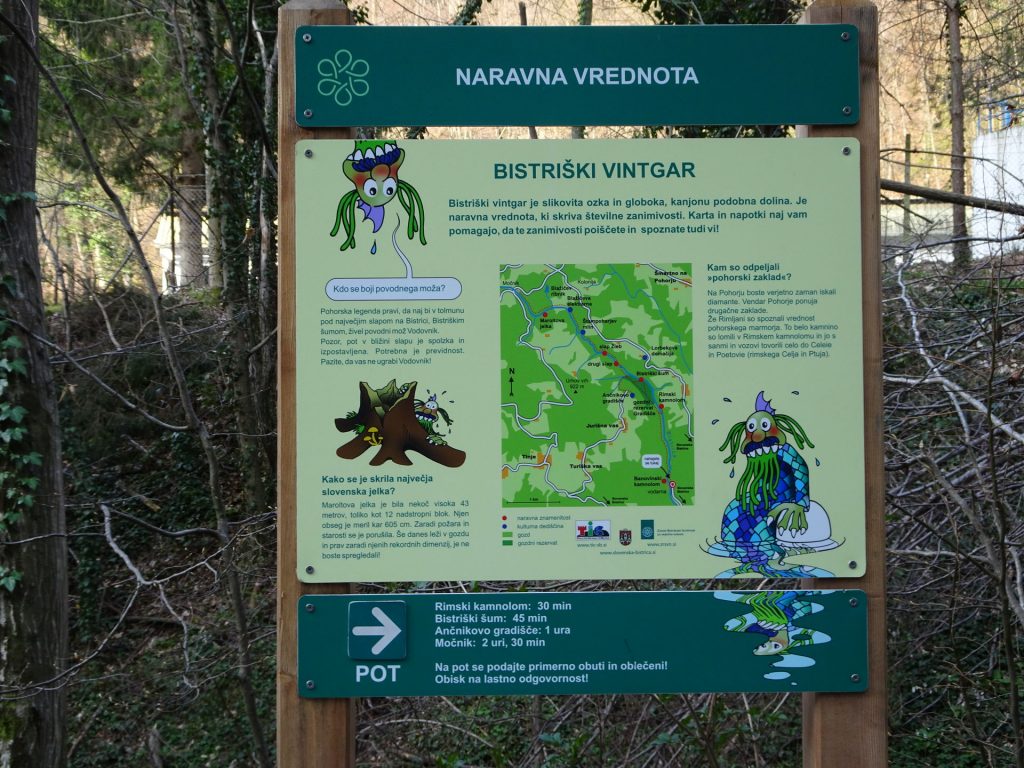 Krožno pot boste začeli pri vodovodnem zajetju, kjer lahko parkirate avto. Do rimskega kamnoloma imate dobre pol ure hoda, ravno prav, da se dovolj segrejete. Tik preden boste prišli do rimskega kamnoloma, boste opazili ostanke prvega mlina. Ves čas vas pot vodi ob potoku Bistrica in naslednji, postanka vreden ogled, je slap Šum. Spustite se čisto do njega in si ga oglejte povsem od blizu. Med nadaljevanjem poti boste večkrat prečkali potok, verjetno boste imeli tudi malo blatne čevlje. Prava planinska obutev je torej skoraj obvezna. Počasi se dolina zoži, prostora je le še za potok in ozko stezico. Tako prispete do slapa Žleb. Oglejte si ga, posebno veličasten je pozimi. Še nekaj hoda naprej pa boste prispeli do Štempoharjevega mlina, ki je zadnji in edini v celoti ohranjen mlin ob tem potoku. Če boste ob mlinu v pravem času, vas bo bližnji travnik nagradil z morjem vijoličnih žafranov. Tukaj je tudi pravi čas za počitek in malico.