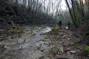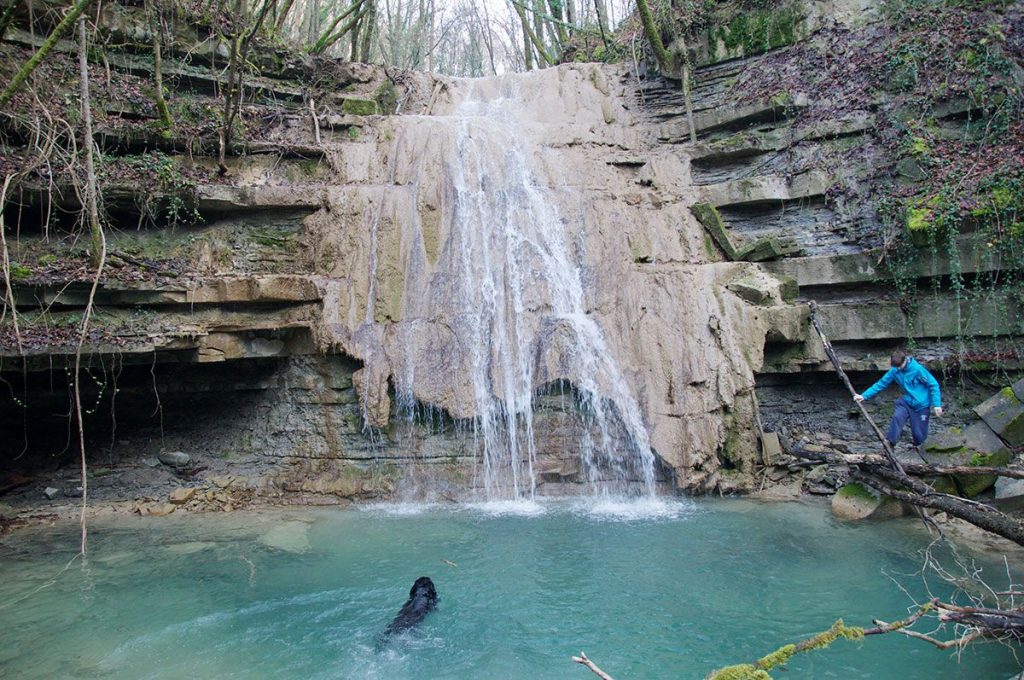 Drugi slap je prav tako impresiven. Voda se po debeli lehnjakovi plasti zliva v smaragden tolmun. Štirinožni bunkeljski prijatelj ga je kljub zimskim temperaturam takoj preizkusil. Na tej točki se lahko manj pustolovski obrnejo in se vrnejo po isti poti, ostali pa nadaljujejo po Larsusovem priporočilu navzgor ob potoku. Sem ne zaide veliko pohodnikov. Potke so preraščene z bodičastim rastlinjem in lepše vidne le ob skalnih skokih ob slapovih, tako da je hoja pravzaprav po brezpotju. Mestoma so prehodi celo izpostavljeni, sploh v mokrem, in si je treba čeznje pomagati z rokami. Larsusov izziv smo sprejeli in bili nagrajeni z dogodivščino v divjini, v kateri bi zlahka posneli kako sceno iz Gospodarja prstanov. Mimo slapov in številnih skočnikov smo se zaradi podrtih dreves prebijali počasi. Celo malo prepočasi, zato smo se kakih 400 m pred izstopom na kolovoz usmerili navzgor po komaj vidni stezici in se priključili grebenu v bližini z GPS točko označenih ruševin.