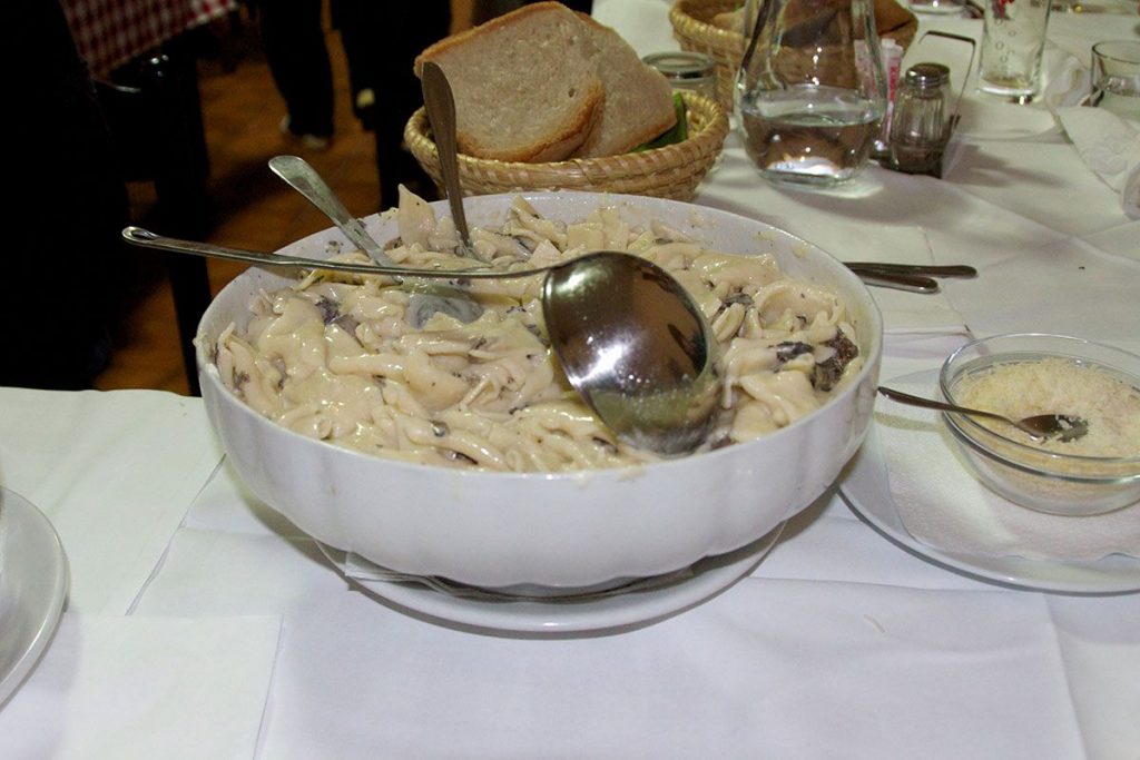 Po treh in pol urah smo bili spet pri avtomobilih. Dan bi si lahko začinili še z obiskom zakladov pri nekaterih bolj ali manj oddaljenih znamenitostih, pa smo se raje odločili za najbližjo, ki mi jo je toplo priporočil sam lastnik zaklada in ljubitelj vodnih doživetij (pa naj gre za vodo v škornju, z neba ali mimo zaklada). Teh krajev se ne sme zapustiti brez primernega obroka fužev s tartufi in najboljša priložnost za izpolnitev te obveznosti je gostilna Belvedur, kjer je tudi eno od označenih parkirišč. Jedilni list je kratek, pa je izbira kljub temu težka. Pridružila se nam je še ekipa bojank, ki si je lakoto nabirala od zaklada do zaklada traila Šavrinke. Na zimsko nedeljsko popoldne smo bili večino časa edini gostje, kar je počasnemu kosilu dodalo še nekaj prvinskosti. Fuži s tartufi in stegno divjega prašiča izpod peke so bili prav tako izvrstni kot doživetje celega dneva.