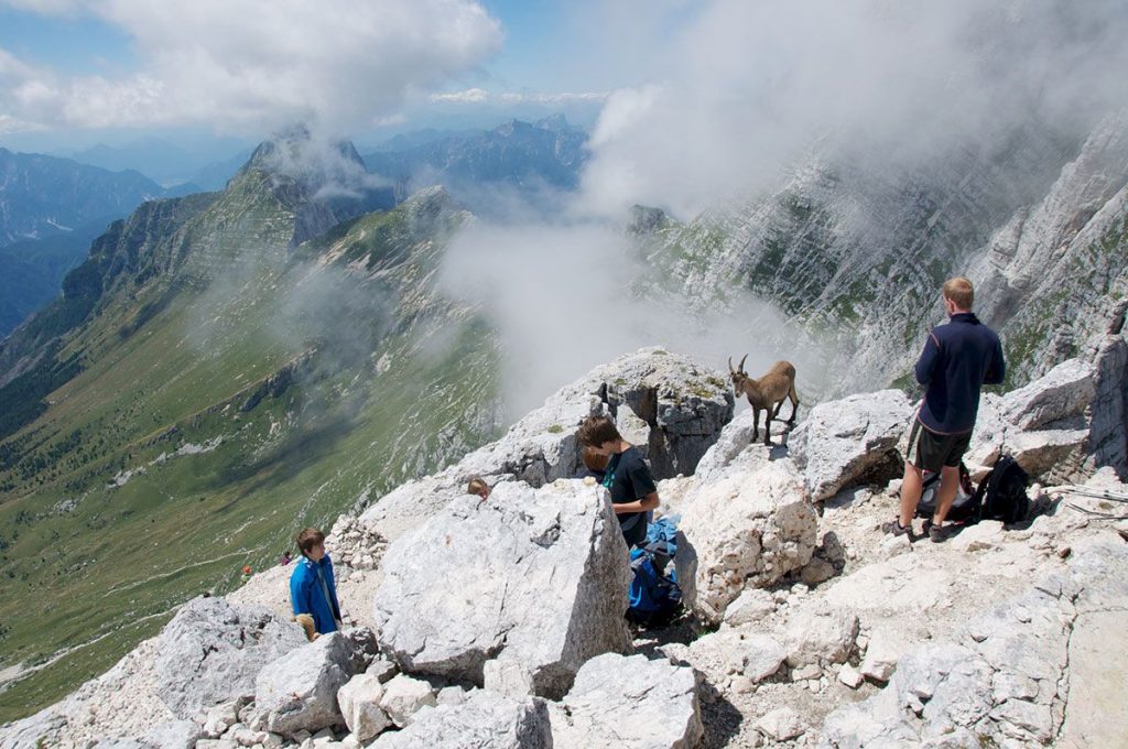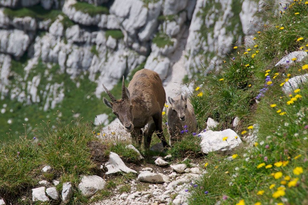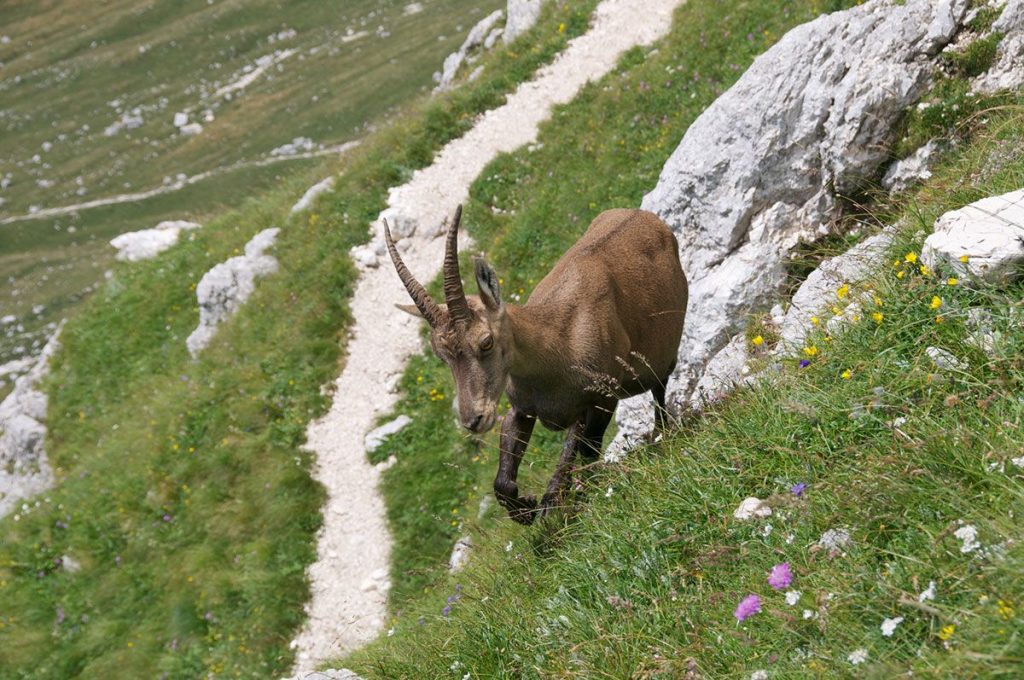 Bolj kot se bližate višini 2.000 m, več je kozorogov, glavne znamenitosti te gore. Še nikjer jih nisem videl toliko kot tukaj. Večinoma so to samice z mladiči in mlajši samci z neizrazitim rogovjem, zato marsikdo meni, da to niso kozorogi ampak neke vrste divje koze. Da takoj razčistimo z zoologijo: kozorog (Capra ibex) je divja koza, meter in več dolgo rogovje, kot ga poznamo iz pravljice o Zlatorogu in blagovne znamke istoimenske pijače zgoraj omenjene barve, pa imajo odrasli samci. Pogosto se bo zgodilo, da se bodo živali brezskrbno pasle na stezi ali tik ob njej in v zadnjem trenutku odskočile za meter ali dva. Proti vrhu, ko vam bo že malo zmanjkovalo moči, bodo srečanja dobrodošel razlog za postanek.