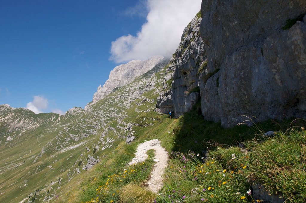 Hoja do vznožja stene je ogrevanje, med katerim se povzpnemo za kakih 250 m. Strmo južno pobočje premagujemo po vijugavi, a udobni stezi, ki sledi dolgim skalnatim in travnatim policah. Če poleti niste dovolj zgodnji, imejte s sabo vsaj veliko pijače, sonce je tukaj neusmiljeno. Pot ni izpostavljena in tudi ne strma, edina nevarnost – posebej v mesecih, ko je obisk velik – je kamenje, ki ga občasno sprožijo planinci in rogati domačini in na poti v dolino nima pravih ovir. Opis poti zato svetuje čelado. Priznam, da je nisem imel, priznam, da je enega od članov naše odprave srednje velik kamen zgrešil za kak meter, priznam pa tudi to, da sem kljub previdnosti sam sprožil enega ali dva.