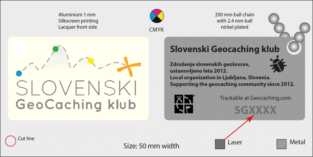 Kot vidite na tehnični sliki zgoraj, nismo odkrivali Amerike (lahko pa, da jo bo odkril vaš sledljivček in jo prekrižaril po dolgem in počez) in naš TB zasnovali kot standardno potovalno ploščico. Tudi mere so podobne, 50 × 30 mm. Pa cena 5,90 € prav tako. Še vedno smo mnenja, da so sledljivčki v naši spletni trgovini najcenejši v Evropi. Logotip na sprednji strani je na barvni podlagi, ki mu bo (upamo) dala nekoliko starinski in mehkejši videz. Pred vsem, kar ga lahko doleti na poti (razen pred dolgoprstimi bunklji), ga ščiti trda epoksi prevleka. Zadnja stran ima kovinsko podlago in napis, ki za neslovensko govoreče geolovce Slovenski Geocaching klub umesti v prostor in čas. Pa seveda sledilno kodo, brez katere ploščica ne bi bila sledljivček. 😉