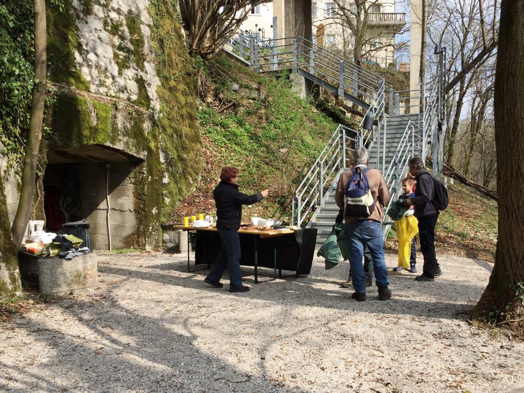 Že zbiranje nam je šlo tako dobro od rok, da smo ga ob klepetu in vpisovanju v dnevnik kar malo podaljšali. In izkoristili priložnost, da smo razdelili kartončke CITO izziva 2017. Potem pa je Sokol^2 odločno ukazal odhod v lanski CITO revir, Kanjon Kokre. Na prvi ploščadi nad kanjonom smo prejeli osnovne napotke in vreče za odpadke. Na drugi ploščadi smo se prepričali, da so Kranjčani akcijo vzeli za svojo, saj nas je tam že čakala stojnica s pehtranovo potico in napitki, ki človeku poženejo kri po žilah. Spet se je izkazala tista stara ljudska modrost, da ne odlašaj za pol ure, kar lahko narediš takoj. Vleklo me je k smetem, pa sem ponudbo preskočil, ob povratku pa je bila stojnica že počiščena kot kanjon pod njo.