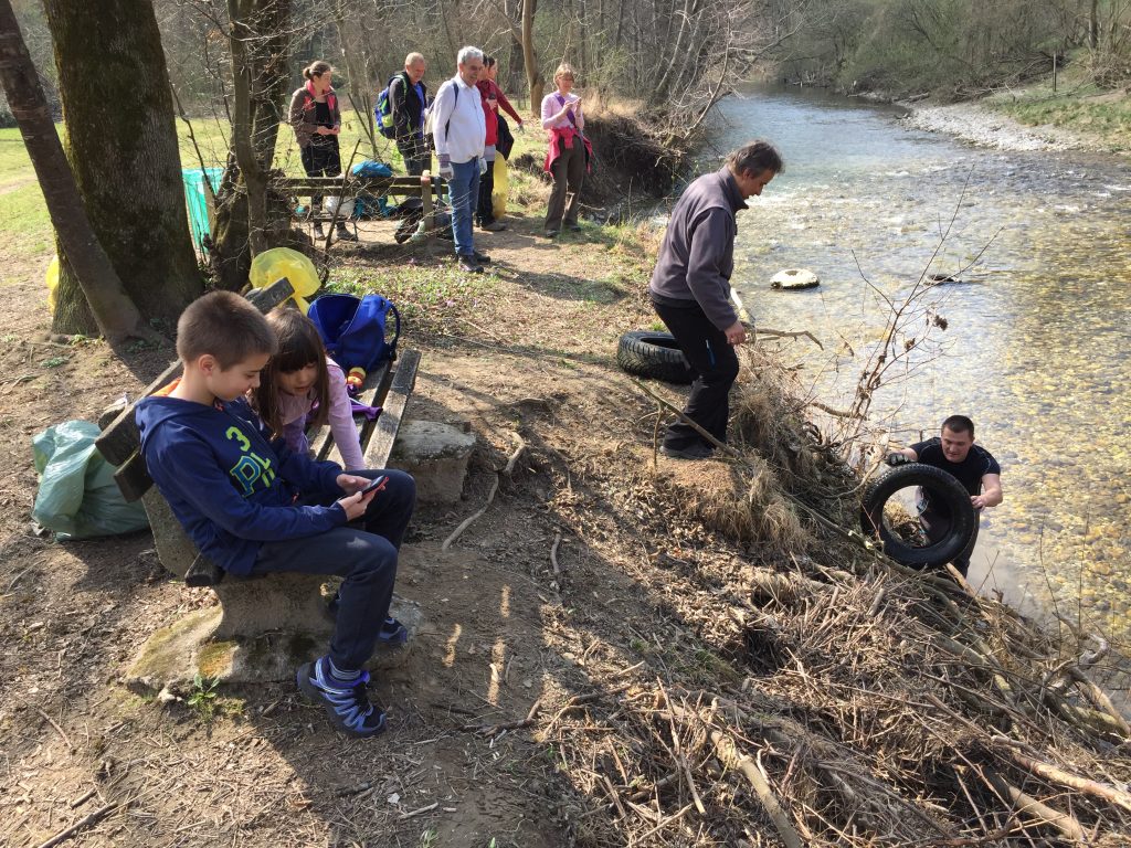 Posladek na izstopu iz kanjona je primerno nadomestil tisto, kar sem zamudil na stojnici malo nižje. V nadaljevanju dela smo se usmerili ob Kokri navzgor. Na prostranih travnikih smeti ni bilo, zato pa so se vreče pričele občutneje polniti na brežini pod hišami, drzno postavljenimi na skalni rob. Glede na vrsto odpadkov, ki so se prikotalili po bregu, se zdi, da nekateri že pri zajtrku ne ločijo med smetnjakom in oknom. Do mosta se je marsikaj našlo tudi na bregovih Kokre. Tudi en pametni telefon, ki ga je pamet žal zapustila. Ker je bila SIM kartica odstranjena, lahko sklepamo, da je pamet zapustila tudi lastnika. Na drugem bregu smo smet po smet prišli skoraj do geolovcem poznane lokacije, ko so našo pozornost pritegnile avtomobilske gume v reki. Krossnik in najstarejši član ekipe Romtim sta izdelala priročno orodje (zavistno smo pogledovali na drugo stran, kjer sta dva bunklja vihtela palici s kavljem in vlekla smeti na breg kot za šalo) in na veliko žalost postrvi, ki jim je nevarni odpadek popestril dolgočasni prod, izvlekla, kar je najbrž odvrgel lastnik nekega trikolesnika.