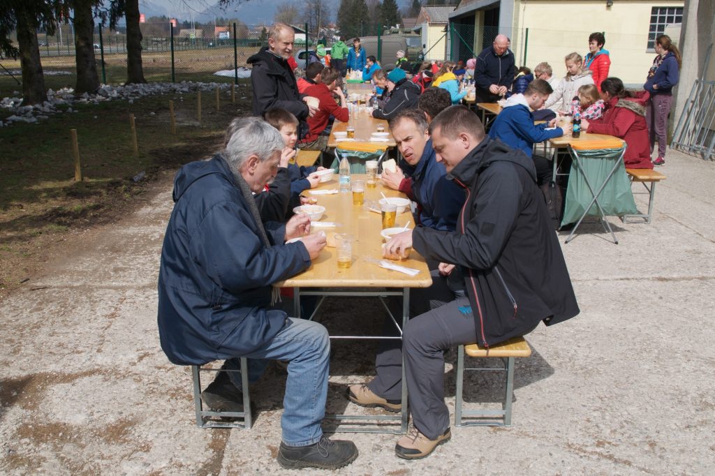Konec? Nikakor. Čas je bil za druženje in geoklepet v dolgi vrsti za palačinke, pa za skupinski obisk že omenjenega mostu, ob katerem se je nenadoma pojavil zaklad nekih gadov. In seveda za kosilo (palačinke so bile vendarle bolj aperitiv) in hmeljen ali nehmeljen napitek, ki smo si ju prislužili z dopoldanskim delom. Poleg golaža, ričeta z ali brez in jote je na mizo prišel še cel kup sledljivčkov, s katerimi so si Kremenčkovi izdatno popravili uvrstitev na lestvici Prijateljske lige. In šele potem so eni odšli domov, drugi pa še na Planetarni potep do bližnjih zakladov.