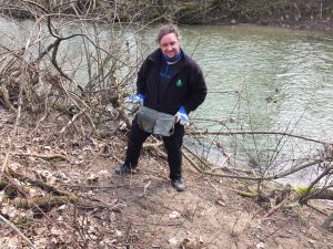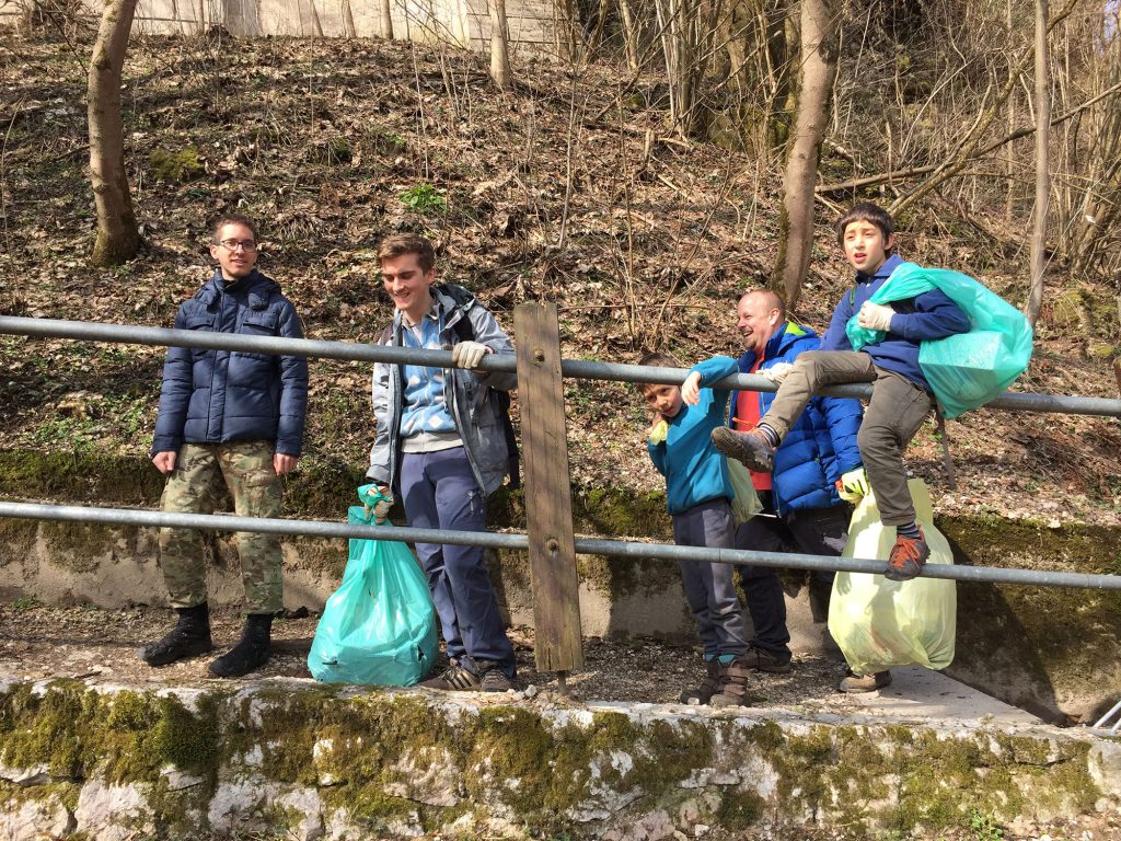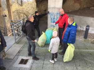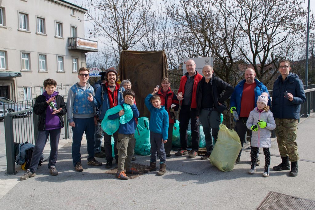 Po kratkem premoru, med katerim smo se seznanili s trenutnim stanjem v Planici, smo nadaljevali po kanjonu navzgor. Sprehod, sicer znan iskalcem EarthCache zaklada. Ta del je pred nami že pregledala druga skupina prostovoljcev, ki pa se je osredotočila predvsem na bregove Kokre, tako da je tudi za nas ostalo še nekaj takih in drugačnih odpadkov. Predvsem na pobočju pod hišami, ki ga nekateri stanovalci očitno zamenjujejo s smetiščem. Da bi tukaj pobrali vse, kar se skotali po bregu, je misija nemogoče. Zato se nas je večina omejila le na večje kose, ki jih je mogoče reciklirati. Pot smo nadaljevali do mostu, ki smo ga nekaj kasneje obiskali še enkrat (ob resnem delu ni časa za FTF vragolije), potem pa po drugem bregu nazaj in po brezkončnih stopnicah iz kanjona na standardno mesto za skupinsko fotko. Zdi se, da smo letos nabrali več smeti kot lansko leto. Smo bili bolj temeljiti ali nas je bilo samo več?