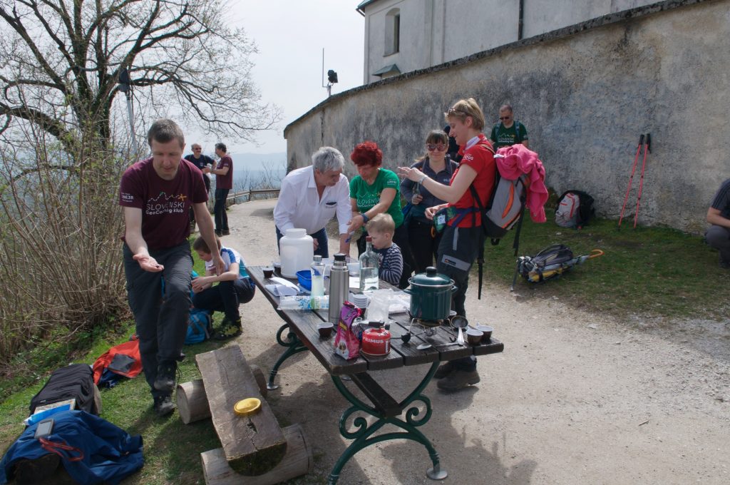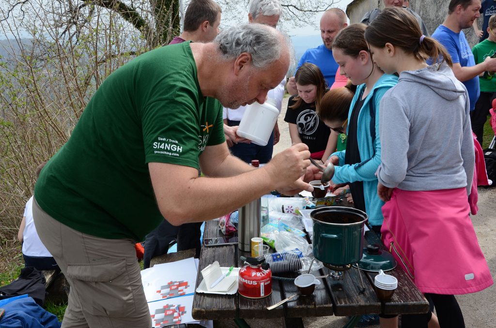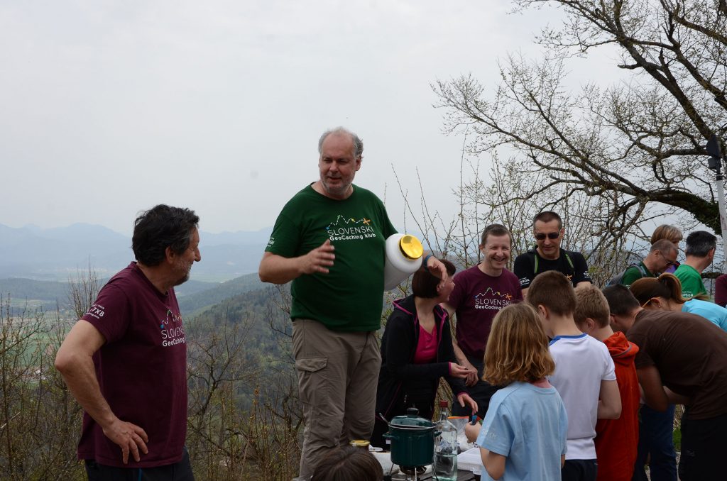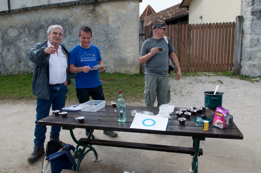 Naprej je šlo po pričakovanjih. Oziroma ne čisto po pričakovanjih, saj smo, to kar odkrito priznam, pričakovali nekoliko manjšo udeležbo kot prejšnja leta. V to sem bil še toliko bolj prepričan, ker sem na Zeleni točki ob 9.15 pokukal v škatlico, pa ni bilo v dnevniku še nobenega vpisa. Prejšnja leta so se prvi vpisovali že pred sedmo… Pa ni bilo razloga za paniko. Udeleženci so kapljali z vseh strani, prva runda kave je pošla v trenutku, nivo tekočine v steklenici z napitkom dobrodošlice se je nižal in nižal, ko so Kompaski začeli deliti eno od svojih številnih mojstrovin, slastne baklave, pa se je na standardni lokaciji že trlo ljudi. Bunklji so pogledovali od daleč, a ker je bil vsak drugi udeleženec v majici Slovenskega Geocaching kluba, so nekako dojeli, da postrežba ni zanje, in ostali na distanci. 😉