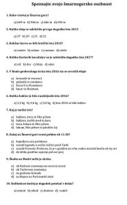 Na vrhu sem imel tako dobrih deset minut časa, da zasedem vse klopce v krogu 10 m od objavljenih koordinat, se ohladim in preoblečem v zeleno SGK majico. Potem se je prikazal prvi udeleženec, dedi Morska riba. Kar takoj sem ga porabil za poskusnega zajčka letošnje novotarije, vprašalnika v stilu kviza iz prejšnjih let. Vprašanja so bila podobno trapasta, z njimi pa smo v slogu podobnih zadev iz rumenega tiska odkrivali skrito šmarnogorsko osebnost udeležencev. Kdor bi se rad preizkusil, si lahko vprašalnik prenese s klikom na zgornjo sliko. Koliko točk lahko dosežete brez prepisovanja s spleta? In brez pomoči vrstice s pravilnimi odgovori na dnu druge strani, seveda! Si upate rezultat zapisati v komentar prispevka? 😉