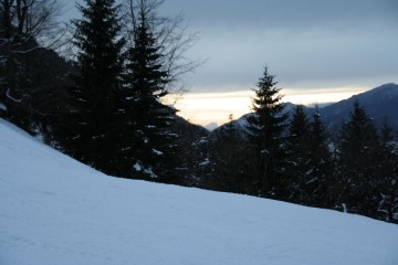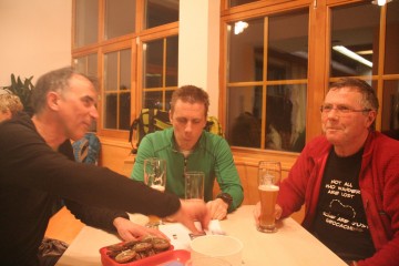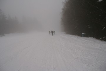 Ker so bile v sredo zvečer razmere na cestah v tistem koncu še zelo slabe, smo se na pot odpravili v četrtek zgodaj popoldan. Vožnja je hitro minila, ob štirih smo že parkirali na nam zelo znanem mestu. Sledilo je pripravljanje opreme, mladina je seveda štrajkala. Slabo uro kasneje je sovca že sopihala proti vrhu, sam pa sem počakal organizatorja in druge udeležence, skupaj smo jo mahnili navzgor. Vsak je držal svoj ritem, pa vendarle nismo bili daleč narazen. Sam sem se vzpenjal med klepetom s RedChillyjem. Bilo je prav prijetno. Po uri in pol ter vmes najdeni škatlici smo prispeli do restavracije, ki je ob četrtkih izjemoma odprta do 22h. In bila je nabito polna.