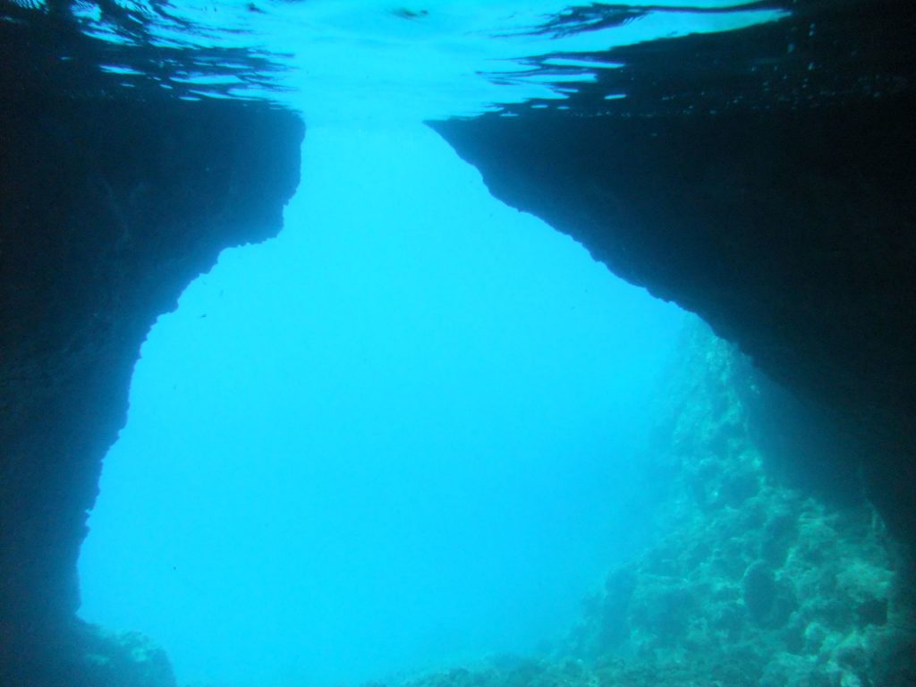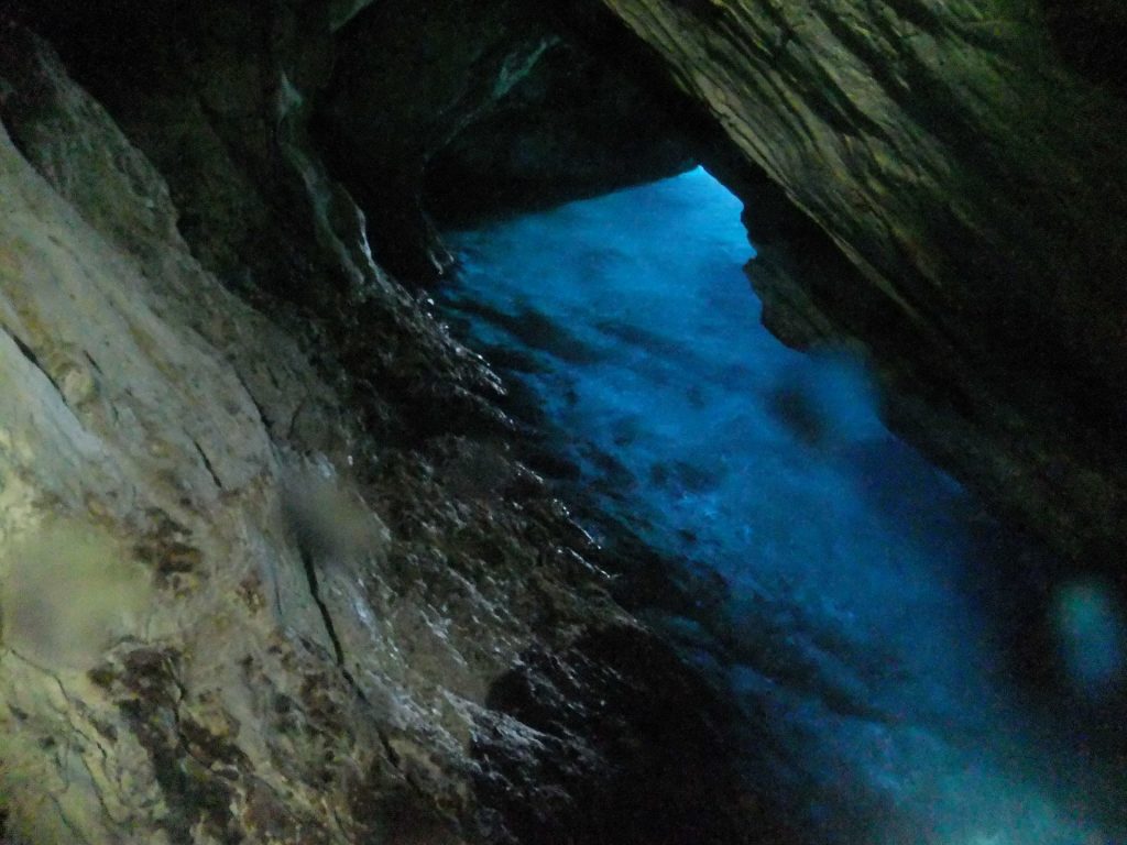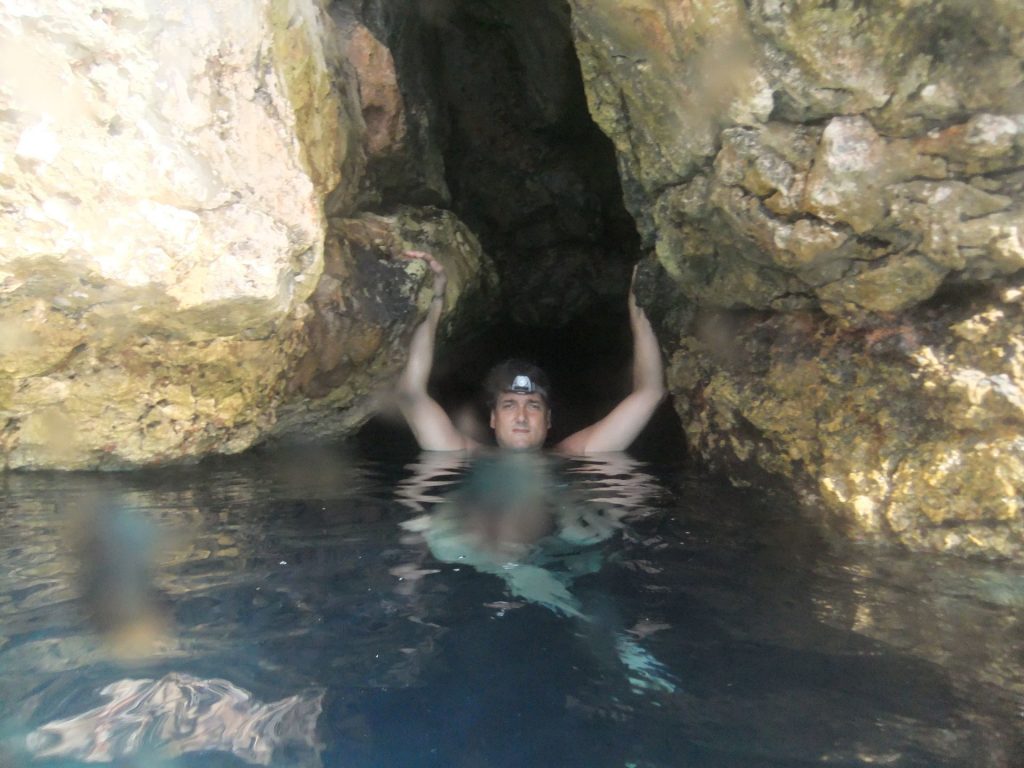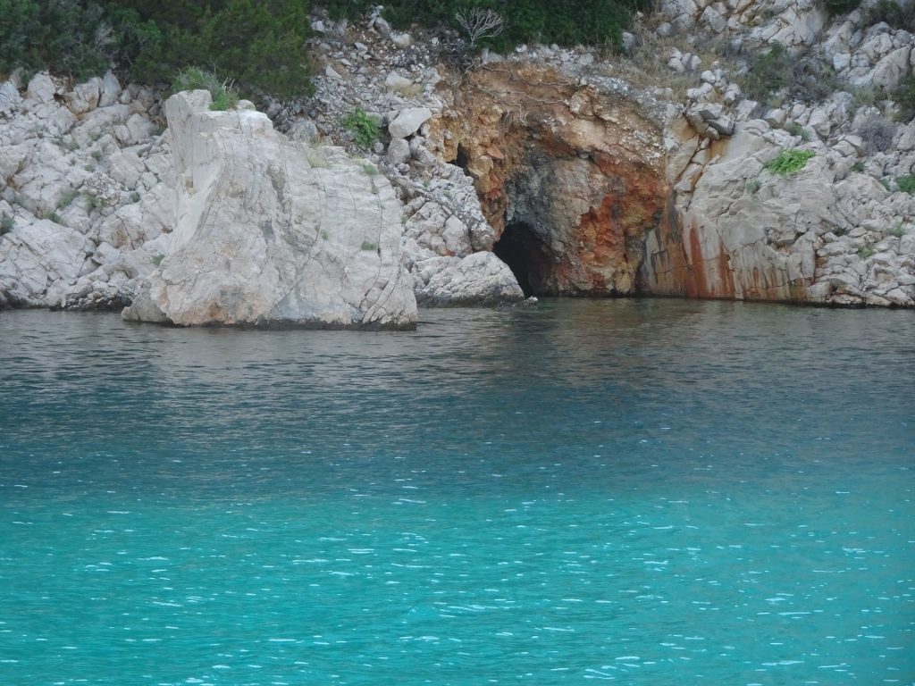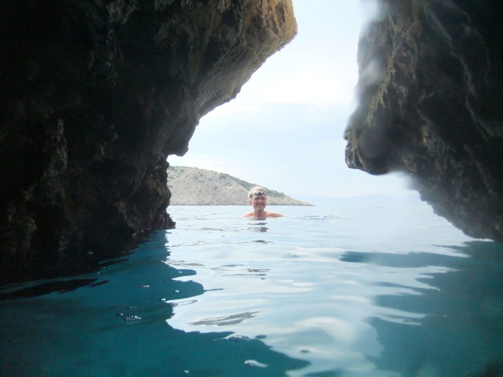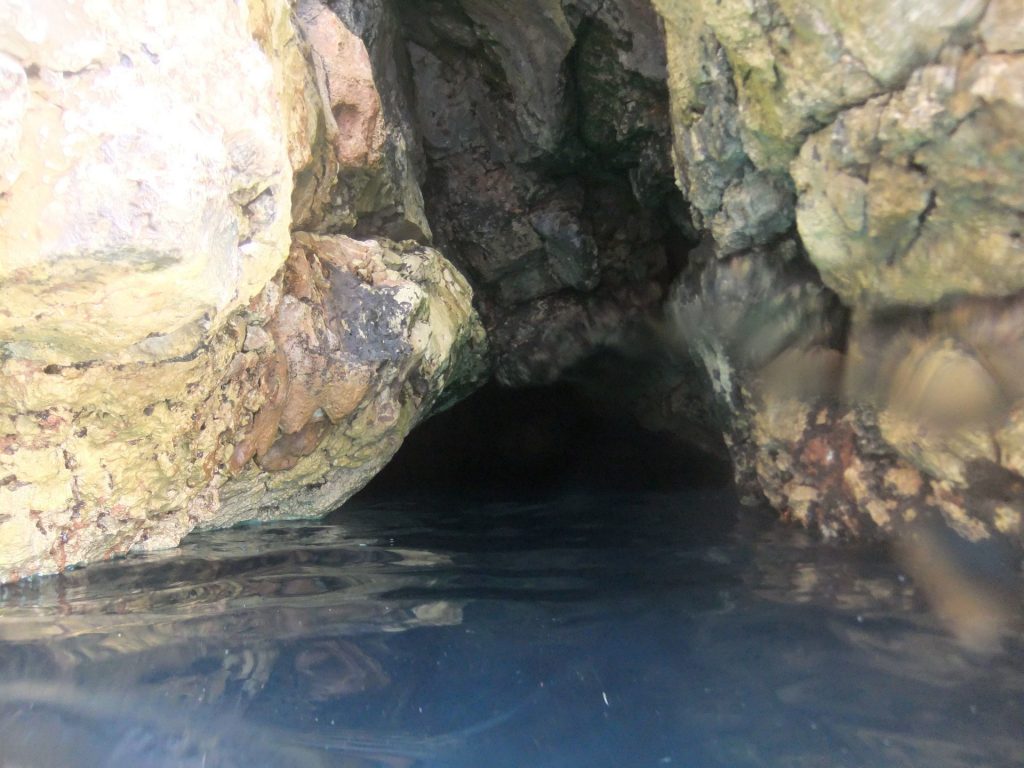 »Gremo plavat!«, tečnarita tamali dve. Vsi štirje odplavamo na drugo stran zaliva proti veliki skali, za katero pa se, glej ga zlomka, prikaže velika jama. Vhod je zakrivala velika skala, za njo pa kakšnih 10 metrov globoka jama z dvema luknjama za vhod. Popolnoma nevidna s plaže.
