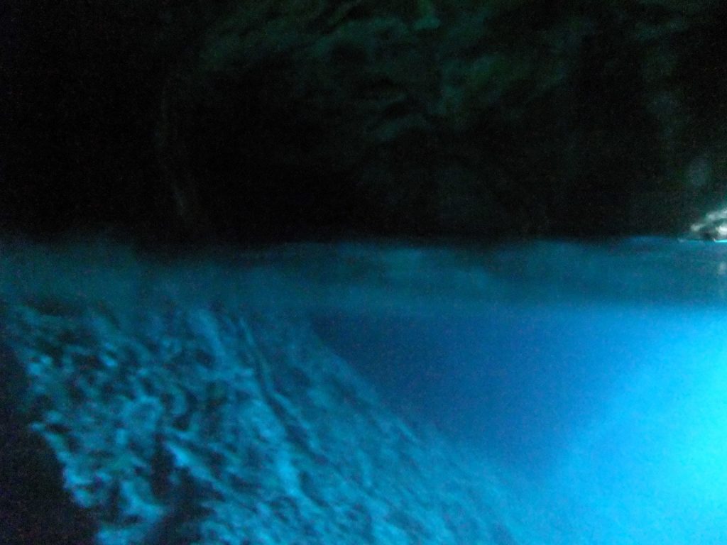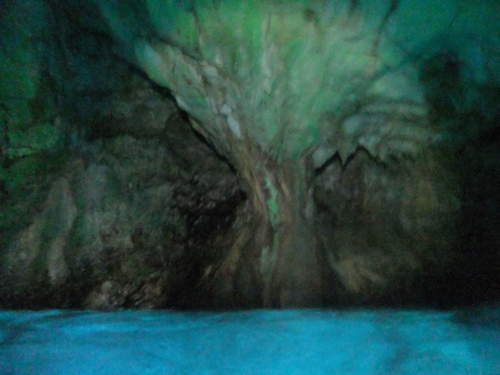 Prebil sem se skozi vhodno luknjo in pred mano se je prikazala precej velika luknja, širine kakšnih 6 metrov in globine kakšnih 12 metrov ali pa še mogoče več. Zgleda tako kot una Modra Špilja na Visu … ali pa še lepše. Kot da sem priplaval v Postojnsko jamo. Na desni strani je steber, vse povsod pa polno stalagmitov in stalaktitov in skalnatih zaves. Čudovito, ampak mene je strah ko pesa. Simono, ki je čakala tam zunaj, pa še bolj. Kar nekam sem izginil, prej pa se nisva nič dogovorila. Je že naštudirala, kam bi klicala za SOS, pa kaj bo rekla, edino imena zaliva ni vedela…