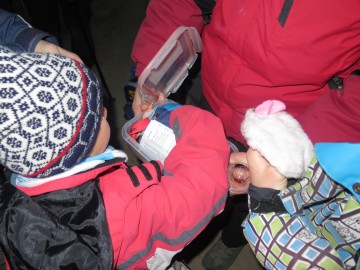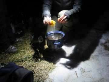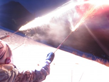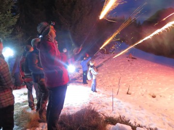 Res pa je bilo potem oboje: krvavo rdeči meč je razkril zaklad, pri smrečici pa smo dobili novoletna darila. Otroci so se kmalu nagnetli okrog gorilca, na katerem se je že grel čaj iz melise, mete, ognjiča, žajblja, islandskega lišaja, bezga, timijana, materine dušice in šipka, pocukran s ščepcem stevije. Ali je bila marelično nadahnjena limona zares bolj zrela in sladka od običajnih zelenkasto rumenih, verjetno ve le sovca, ki jo je nazadnje oglodala do kosti. Drugi smo jo samo ovohavali, pomodrovali in nato popili topel čaj, ki se je po hoji prav prilegel. Nadalje smo nočno nebo razsvetlili z nekaj diskretnimi svetlobnimi efekti in popazili, da pri tem nismo plašili divjadi ali naredili kake ognjene nesreče. V očeh smo prav vsi imeli iskrice, saj je bilo na cilju za vsakogar nekaj. Za tiste najbolj pogumne je bil pripravljen “korenčkov liker” posebne ostrine. Klepet in živžav sta se za kratek čas naselila na kraj, ki ni vajen tako množičnega obiska in ga vsekakor velja poiskati tudi podnevi.