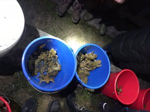 Tretja ponovitev pred ZOO-jem je botrovala rahli nervozi geolovcev, ki so se čimprej hoteli podati na lov in so le s težavo poslušali razlago mladih biologov. Po uvodnem delu pa smo se skupaj zapodili v kanal. Otroci so uživali pri lovljenju malih žabic in za rjavke je bilo potrebno kar nekaj spretnosti. Naša vedrca so se pridno polnila, da smo jih morali sproti odnašati čez cesto. Potem smo se razdelili na skupine po deset in smo skupaj prečesali širše območje parkirišč in ob zaščitni ogradi. Na koncu nam je s skupnimi močmi uspelo prenesti na varno skoraj identično število dvoživk kot lani!? Uradne številke so, če se ni kakšna medtem odčarala v princa ali princezo, 339 žabic, od tega 304 navadnih krastač, 22 sekulj in 13 rosnic. Nekateri so pomagali s selitvijo v naslednjih dneh, našo namero da se vrnemo z manjkajočima članicama, pa je odpihnila epidemija.