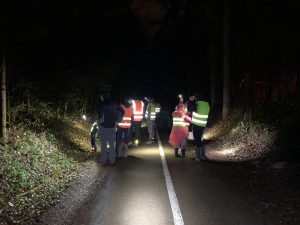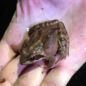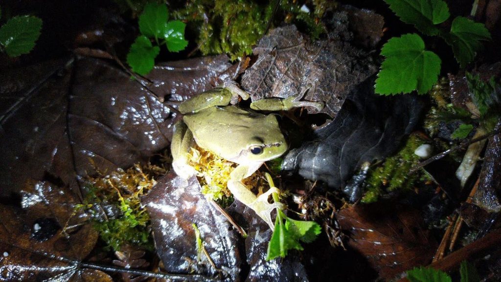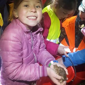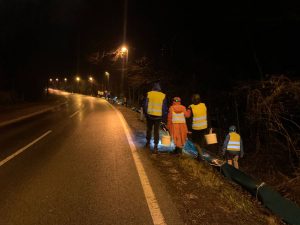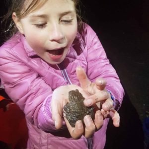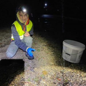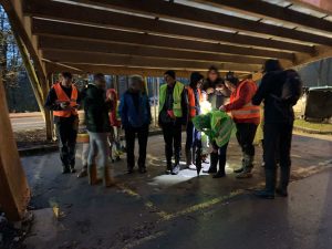 Žan iz Društva študentov naravoslovja nam je naprej razložil nekaj osnovnih pojmov o dvoživkah, za Avstrijce pa smo sproti prevajali. Po 10 minutnem uvodu nam je Žan razdelil vedra, saj svojih nismo smeli imeti, ker baje razsaja neka žabja bolezen. Vsi smo že čakali na akcijo in ko smo dobili dovoljenje za napad, so se na iskanje najprej zapodili otroci. Vsi smo imeli svetleče jopice in svetilke. Na cesto smo postavili tudi znak, da se nekaj dogaja, saj je cesta precej prometna. Na začetku dvoživk ni in ni bilo, tako da smo že bili v dvomih al’ kaj sploh bo. Na začetku jih je bilo res malo, ko pa smo prišli na ovinek blizu tretjega ribnika, pa so bili kriki iz teme: “Našel!” vse pogostejši. Izmed punc – Zarja, Petra, Mia in Rubi – je bila najpogumnejša Petra, ki je bila taksist za krastače in žabe od njihove najdene lokacije do vedra. Žabe smo sproti šteli in jih na koncu poti imeli popisanih 35. Mislim da je vsak našel vsaj eno. Nekateri so jih samo iskali, pri prenašanju pa je pomagala taksi Petra. No, pogum na nekatere še vedno čaka nekje tam zunaj.
